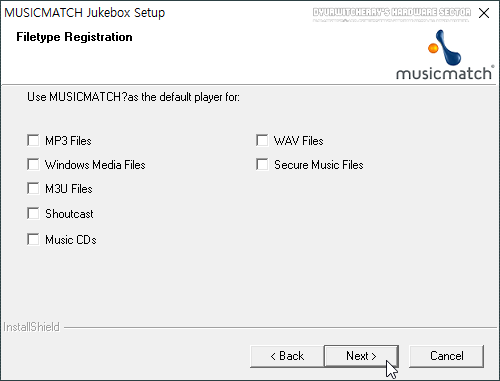 뮤직 매치 주크박스 Filetype Registration에서는 'MP3'와 'WMA', 'M3U'와 'Shoutcast'와 'Music CDs', 'WAV'와 'Secure Music Files' 등의 항목이 모두 '☑' 체크되어 있으며, 필요하지 않은 파일 연결 항목은 '□' 체크 해제하고 'Next >' 버튼을 누르면 설치가 진행됩니다.