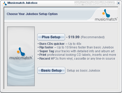 MusicMatch Jukebox 설치를 완료하면, Choose Your Jukebox Setup Option 창이 활성화 되어 48x 이상의 CD 버닝과 Rip faster, Super Tag와 CD 레이블 프린트, Record 기능 등이 추가 되어 라이선스 비용 $19.99의 뮤직매치 주크박스 플러스와 무료 버전인 베이직 버전 중 선택화면이 나타나며, Basic Setup을 클릭하여 종료하면 됩니다.