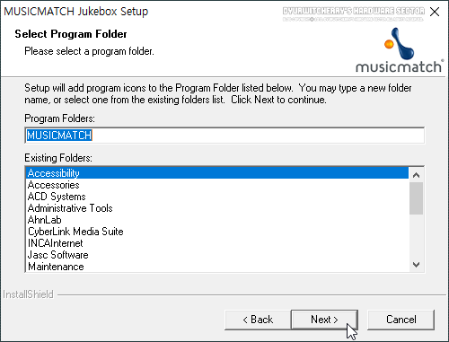 윈도우 시작 메뉴에 'MUSICMATCH' 프로그램 폴더 생성 여부 단계에서 기본값 확인 후 하단의 'Next >' 버튼을 클릭하여 다음 단계를 진행 합니다.