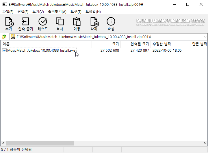 뮤직매치 주크박스 10.00.4033 마직막 버전은 세븐집(7-Zip) 22.01 버전으로 20,000KB 단위로 분할 압축하여 첨부한 'MusicMatch Jukebox 10.00.4033 Install.zip.001', 파일과 '*.zip.002' 두개의 파일을 다운로드 받아 분할 압축을 풀고, 'MusicMatch Jukebox 10.00.4033 Install.exe' 파일을 실행하여 설치하고 사용할 수 있습니다.