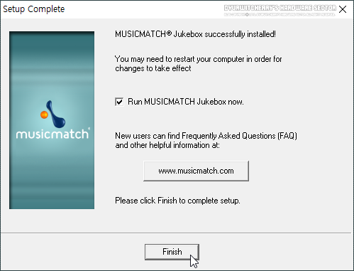 뮤직 매치 주크박스 설치가 완료되면 '☑ Run MUSICMATCH Jukebox now.' 항목에 체크되어 있어 'Finish' 버튼을 클릭하면 프로그램이 바로 실행 됩니다.