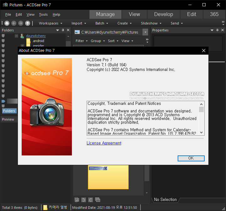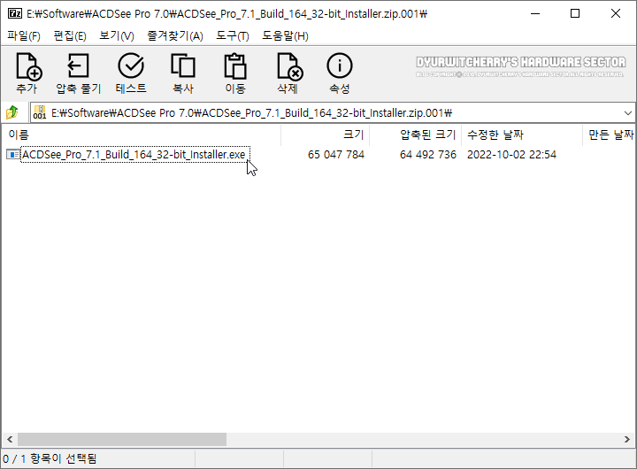 이미지 뷰어 및 편집 프로그램 ACDSee Pro 7.1 32비트 버전은 설치파일 크기 약 62.0MB로, 세븐집(7-Zip) 22.01 버전으로 20,000KB 단위로 분할압축 하여 첨부한 네개의 'ACDSee Pro 7.1 Build 164 32-bit Installer.zip.001' 파일과 '*.zip.002', '*.zip.003'과 '*.zip.004' 파일을 모두 다운로드 받아 분할 압축을 풀고 실행 파일을 클릭하여 설치하면 됩니다.