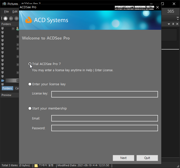 ACDSee 프로 7 버전을 설치하면 'Welcome to ACDSee Pro' 메시지 창이 활성화 되어, '◉ Trial ACDSee Pro 7'의 라디오 버튼을 선택하여 평가판 트라이얼 버전으로 사용하거나, 라이선스를 보유하고 있는 경우에는 '◉ Enter your license key'를 체크하고 'License key:'를 입력하여 정품으로 사용할 수 있습니다.