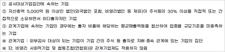중소기업 상한기준은 업종에 관계없이 자산총액 5,000억원 미만이 적용되고, 계열관계에 따른 판단기준인 독립성 기준으로, '① 공시대상기업집단에 속하는 기업', '② 자산총액 5,000억 원 이상인 법인(외국법인 포함, 비영리법인 등 제외)이 주식등의 30% 이상을 직접적 또는 간접적으로 소유하면서 최다출자자인 기업', '③ 관계기업에 속하는 기업의 경우에는 출자 비율에 해당하는 평균매출액등을 합산하여 업종별 규모기준을 미충족하는 기업' 등은 중소기업에서 제외됩니다.