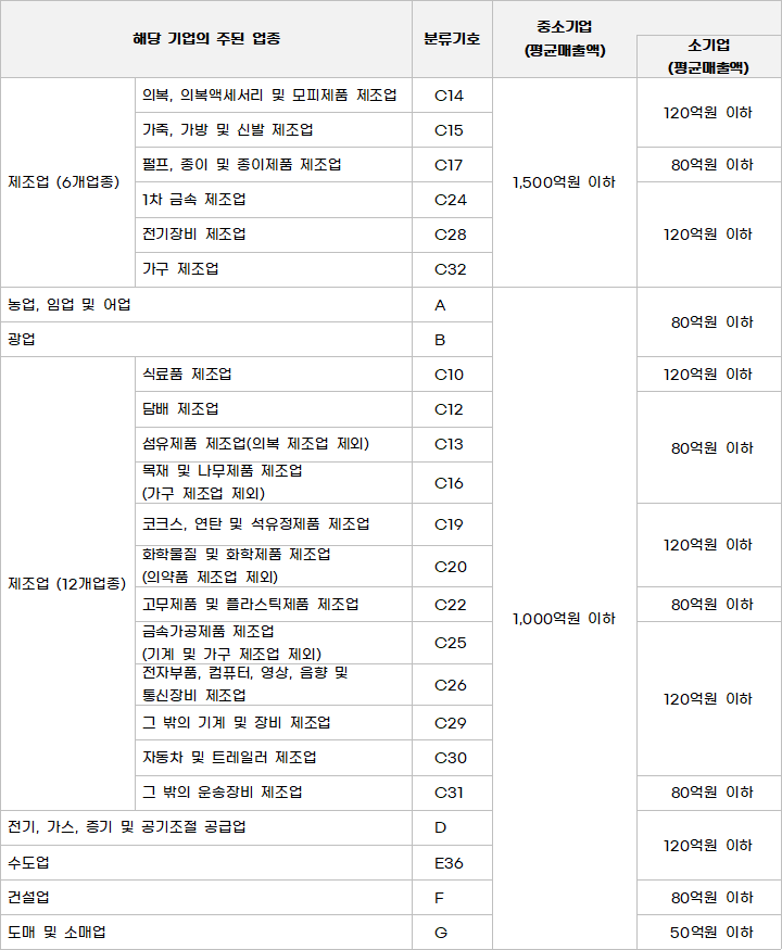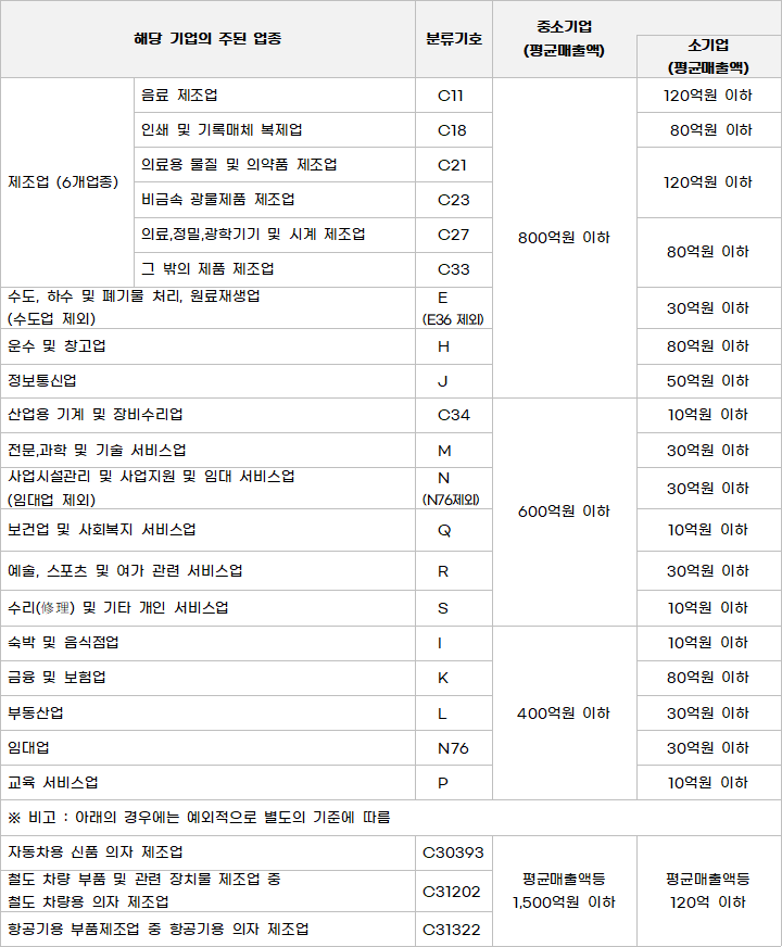 농업과 어업, 임업(A)과 광업(B), 식료품 제조업(C10)과 담배 제조업(C12), 섬유제품 제조업(C13)과 목재 및 나무제품 제조업(C16), 코크스와 연탄 및 석유정제품 제조업(C19), 화학물질 및 화학제품 제조업(C20), 고무제품 및 플라스틱제품 제조업(C22), 금속가공제품 제조업(C25), 전자부품, 컴퓨터, 영상, 음향 및 통신장비 제조업(C36)과 그 밖의 기계 및 장비 제조업(C29), 자동차 및 트레일러 제조업(C30)과 그 밖의 운송장비 제조업(C31), 전기와 가스, 증기 및 공기조절 공급업(D), 수도업(E36)과 건설업(F), 도매 및 소매업(G) 등은 매출액 1,000억원 이하인 경우 중소기업에 해당이 됩니다.
