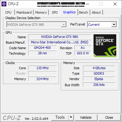 아수스 램페이지 4 지니 X79 메인보드의 PCIe3.0 x16 슬롯에 장착되어 있는 MSI GTX980 TWIN FROZER 그래픽 카드의 스펙 정보로, 메모리는 GDDR5 4GB에 TDP는 165W이며, 구형 NVIDIA GeForce GTX 980 그래픽카드 이지만, 게임을 전혀 하지 않는 사용자에게는 오버스펙 입니다.
