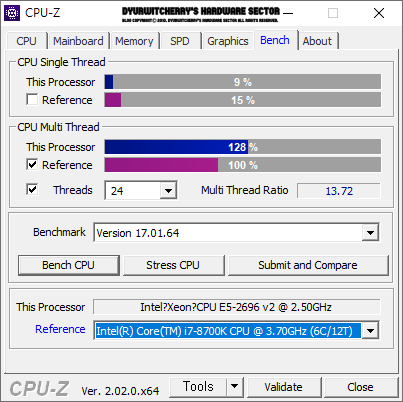 CPUID CPU-Z 2.02 포터블 버전 Bench 탭의 'Bench CPU' 버튼을 눌러 간단하게 CPU 성능을 테스트 한 벤치 결과 화면 캡처하여 첨부한 이미지로, 'Intel Xeon E5-2696 v2 @ 2.50GHz' 제온 프로세서는 'Intel Core i7-8700K @ 3.70GHz'와 'Intel Core i7-10700 @ 2.90GHz'의 중간 정도 성능을 보이고 있습니다. 참고로 인텔 제온 E5-2696 v2 CPU는 서버 PC용 OEM 버전으로, 스펙상 TDP 115W에 터보클럭은 3.3GHz이지만, CPU 정보 상에는 TDP 120W에 Multiplier가 '× 25 (12 - 35)'로, 최대 3.5GHz로 표시되어 시스템에 따라 세부 정보가 다르게 나타날 수도 있습니다.