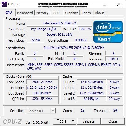 시스템 인포메이션 프로그램 CPU-Z 2.02 버전을 Intel Xeon E5-2696 v2 프로세서를 사용하는 시스템에서 실행한 화면 이미지로, 인텔 제온 E5-2696 v2 CPU는 아이비 브릿지(Ivy Bridge-EP/EX) LGA 2011 소켓 규격에 12 코어, 24 스레드, L3 캐시 30MB이며, 열설계 전력(TDP)는 120W 입니다.