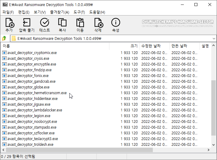 어베스트 랜섬웨어 암호 해제 프로그램 28종은 전체 파일크기 약 51.6MB로, 세븐집(7-Zip) 22.01 버전으로 20,000KB 단위로 분할압축 하여 첨부한 'Avast Ransomware Decryption Tools 1.0.0.499.zip.001'과 '*.zip.002', '*.zip.003' 등 3개의 파일을 모두 다운로드 받아 분할압축을 해제한 후 단일 실행파일을 클릭하여 사용하면 됩니다.