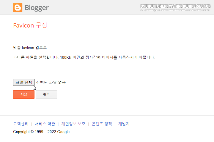 구글 블로그스팟 Favicon 구성 페이지가 새 탭 또는 새 창으로 활성화 되면, 맞춤 favicon 업로드 하단의 '파일 선택' 버튼을 클릭하여 파일 크기 100KB 미만의 정사각형 이미지를 불러오기 합니다. 파비콘 이미지는 아이콘 파일인 '*.ICO' 포맷 이외에 '*.GIF' 또는 '*.PNG' 파일 포맷을 이용하면 됩니다.