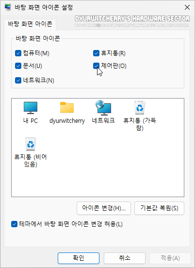 윈도우 11 바탕화면 아이콘 설정 창이 활성화 되면, 기본값에서는 '☑ 휴지통(R)' 항목만 '☑' 체크되어 있으며, '☑ 컴퓨터(M)'와 '☑ 문서(U)', '☑ 제어판(O)'과 '☑ 네트워크(N)' 항목 등 필요한 아이콘을 '☑' 체크하고, '확인 - 적용(A)'을 누르면, 바탕화면에 '내 PC'와 '제어판', '네트워크' 아이콘 등이 표시 됩니다. 참고로, '아이콘 변경(H)...' 버튼을 클릭하여 시스템 아이콘을 변경 할 수 있으며, '☑ 테마에서 바탕화면 아이콘 변경 허용(L)'은 디폴트 값으로 선택되어 있습니다.