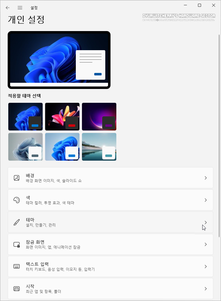 윈도우 11 내 PC 컴퓨터 바탕화면에 아이콘 표시하는 방법은 먼저, 시작 버튼을 눌러 '☼ 설정'을 선택 하거나 바탕화면에 마우스 오른쪽 버튼을 눌러 개인 설정을 클릭한 후 '설정 - 개인설정' 목록에서 '테마 >'를 선택합니다.