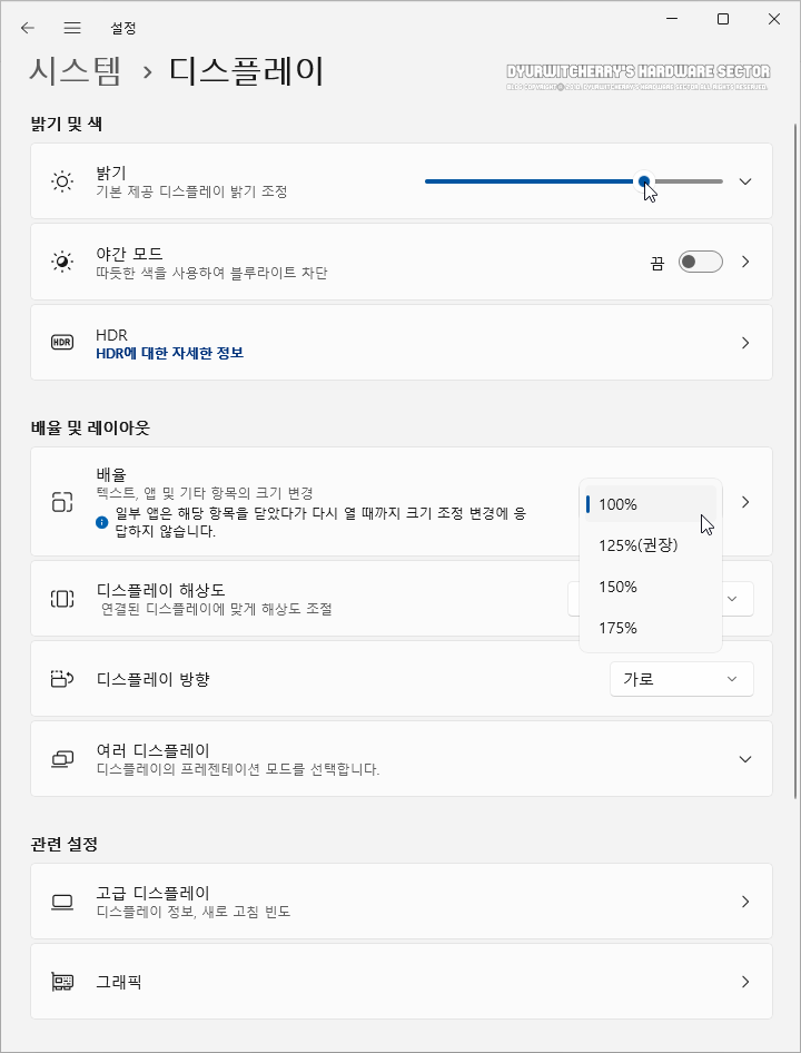윈도우 11 설치 요구 사항 중 디스플레이 항목에는 색 채널당 8비트를 지원하는 9인치 이상의 720P 고화질 디스플레이를 필요로 하며, Windows 11 설치 후 디스플레이 해상도가 125% 기본 배율로 적용됩니다. 컴퓨터의 모니터 화면은