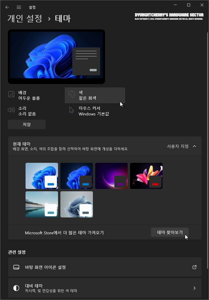 윈도우 11 '설정 - 개인 설정 -테마' 항목에서는 배경 화면과 색상, 소리와 마우스 커서 등의 세부 설정과 함께 '현재 테마 배경 화면, 소리, 색의 조합을 함께 선택하여 바탕화면에 개성을 더하세요.' 우측의 '사용자 지정 ∨' 버튼을 선택하면, 'Microsoft Store에서 더 많은 테마 가져오기'의 '테마 찾아보기' 버튼을 클릭하여 다양한 theme를 다운로드 받아 적용할 수 있습니다. 참고로, 이후 Windows 11 관련 포스팅은 Dark theme가 적용된 화면을 캡처하여 작성할 예정 입니다.