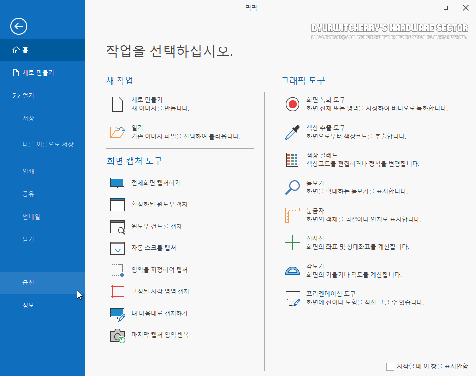 픽픽 화면 캡처 시 파일 이름 자동 저장 형식 변경을 하기 위해서는 먼저, PicPick 프로그램 창 좌측 하단의 '옵션'을 선택하거나, '☑ 시작할 때 이 창을 표시 안함'을 체크하여, 픽픽 홈 화면이 실행되지 않는 경우에는 시스템 트레이의 PicPick 실행 아이콘에 마우스 오른쪽 버튼을 눌러 '옵션(O)...'을 클릭합니다.