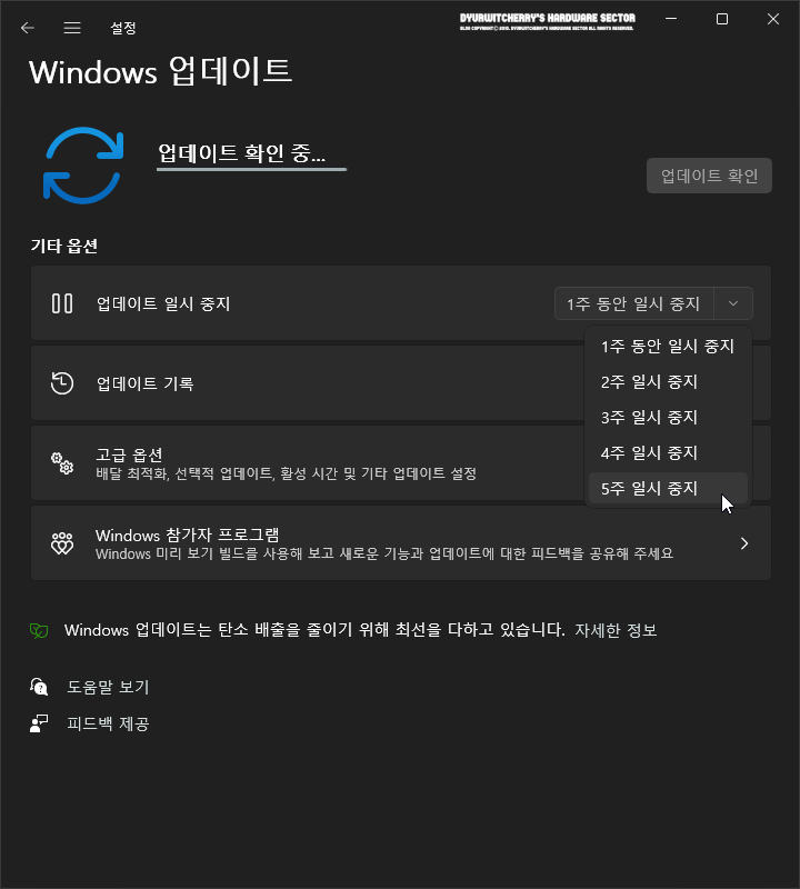 윈도우 11 업데이트를 선택하면, '⟳ 업데이트 확인 중...'이라는 메시지와 함께 바로 Windows 11 자동 업데이트가 진행이 되고, 기타 옵션의 '▕ ▏업데이트 일시 중지' 우측의 '1주 동안 일시 중지 ∨'에서 최대 '5주 일시 중지 ∨' 중에서 선택을 하면, 해당 기간 만큼 자동 업데이트가 중지 됩니다.