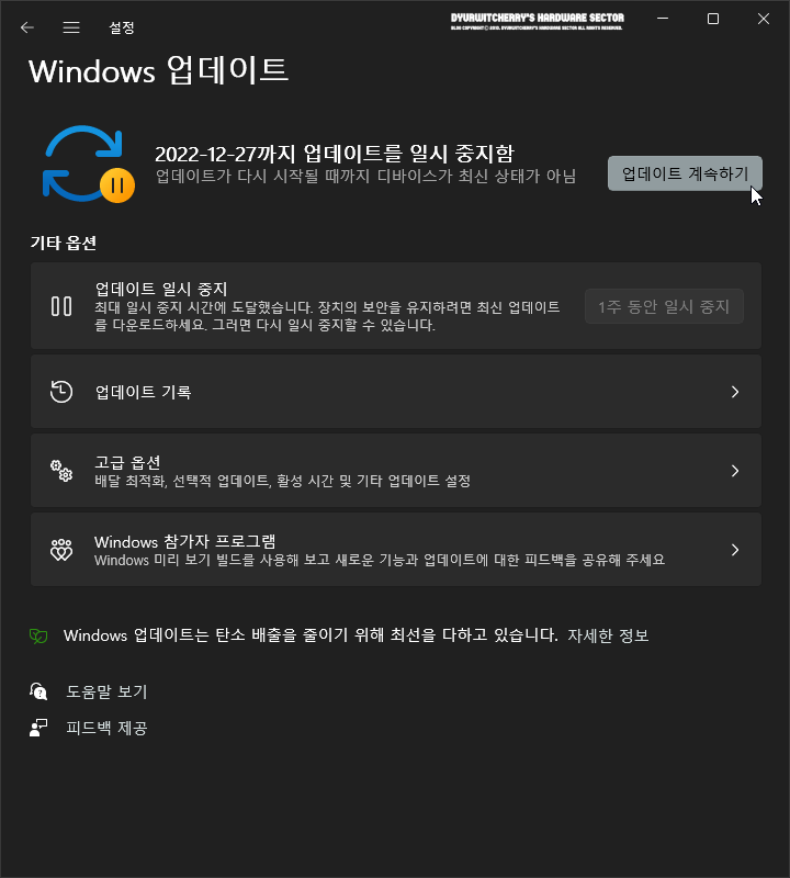 윈도우 11 자동 업데이트를 중지하면, 설정한 기간 만큼 'ex.⟳ 2022-12-27까지 업데이트를 일시 중지함. 업데이트가 다시 시작될 때까지 디바이스가 최신 상태가 아님' 우측의 '업데이트 계속하기' 버튼을 클릭하여 Windows 11 수동 업데이트를 할 수 있습니다. 윈도우 11 업데이트 계속하기 버튼을 클릭한 후 기타 옵션의 '▕ ▏업데이트 일시 중지' 우측의 일시 중지 기간을 다시 설정하면, 레지스트리 수정이나 Windows 서비스의 Windows Update Service를 중지하지 않아도 선택한 기간 만큼 다시 Windows 11 자동 업데이트를 중지 할 수 있습니다.