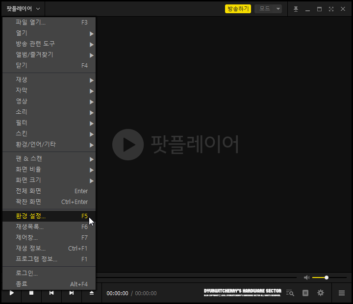 팟플레이어 폰트 변경 및 설정하는 방법은 먼저, PotPlayer 프로그램 좌측 상단의 '팟플레이어 ∨' 항목을 클릭한 다음 '환경 설정... F5'을 선택하거나, PotPlayer 단축키 'F5'를 키보드에 입력하면 '환경 설정' 창이 활성화 됩니다.