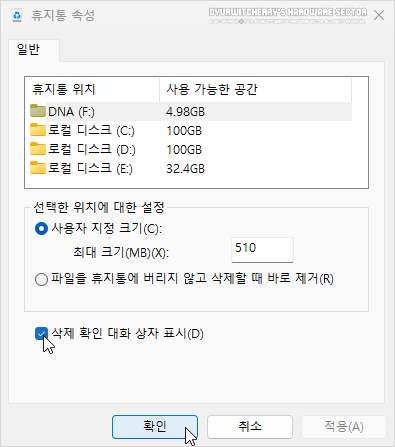 휴지통 속성 창이 활성화 되면, 일반 탭 하단의 '☑ 삭제 확인 대화 상자 표시(D)'를 '☑' 체크하고 '확인 - 적용(A)'을 누르면,윈도우 11에서 휴지통을 비울 때 삭제 확인 대화 상자가 나타나게 됩니다.