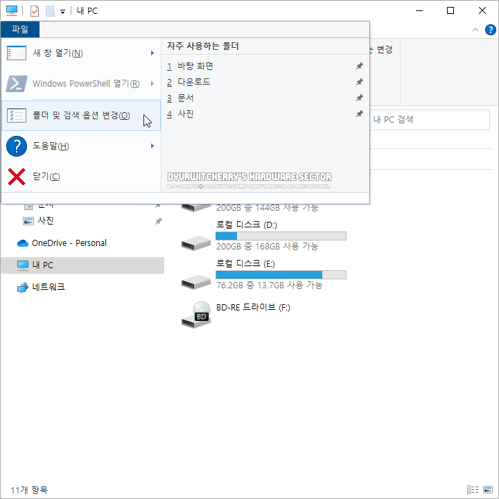 윈도우 10 파일 탐색기 검색 시 색인되지 않은 파일 이름과 함께 문서 내용 검색하는 방법은 먼저, 파일 탐색기를 실행하여 상단 메뉴 항목 중 '파일 - 폴더 및 검색 옵션 변경(O)'을 선택합니다.
