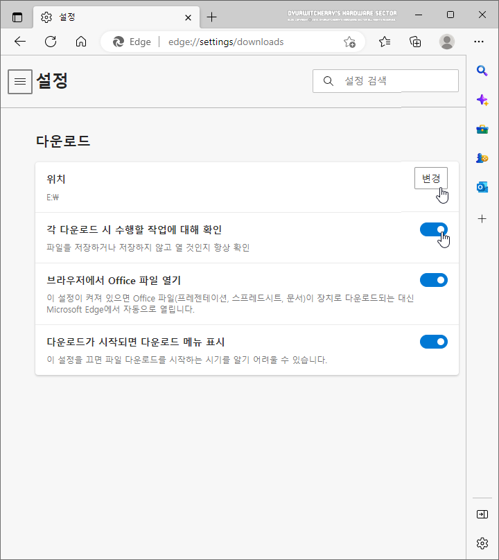 마이크로소프트 엣지 브라우저 다운로드 위치는 'C:\Users\사용자\Downloads' 폴더 경로로 기본값으로 적용되어 있어 다운로드 항목 중 '위치' 우측의 '변경' 버튼을 클릭하여 컴퓨터 내 드라이브나 폴더를 선택하면 Microsoft Edge의 다운로드 폴더 위치가 변경 됩니다. 이와 함께 각 다운로드 시 수행할 작업에 대해 확인의 '○' 토글 버튼을 왼쪽에서 오른쪽으로 이동 시키면, 웹 사이트에서 다운로드 시 파일 탐색기 창이 활성화 되어 저장 되는 드라이브나 폴더를 선택할 수 있으며, 다운로드가 시작되면 다운로드 메뉴 표시의 '○' 토글 버튼을 우측으로 이동 시키면, 진행 상황을 확인 할 수 있습니다.