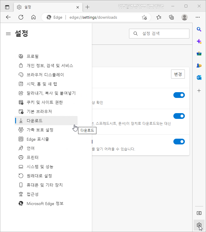 마이크로소프트 엣지 브라우저 사이드바가 표시되어 있는 경우에는 Microsoft Edge Browser 우측 사이드바 하단 엣지 사이드바 숨기기 '⍈' 버튼 아래의 '☼' 설정 버튼을 클릭하여 '☰ 설정(edge://settings)' 메뉴가 브라우저 설정에 따라 새 탭 또는 새창으로 활성화 되면, 좌측의 '⤓ 다운로드' 항목을 선택 합니다.