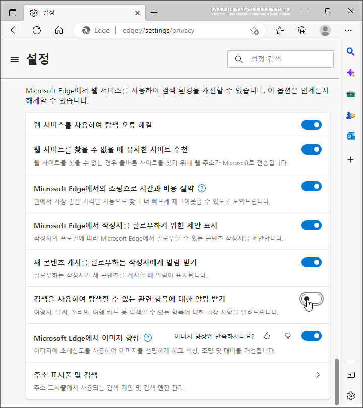 *엣지 검색을 사용하여 탐색할 수 있는 관련 항목에 대한 알림 받기 해제 방법