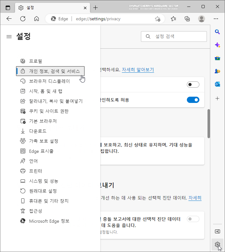 마이크로소프트 엣지 브라우저 사이드바가 표시가 활성화 되어 있는 경우에는 Microsoft Edge Browser 우측 사이드바 아래의 엣지 사이드바 숨기기 '⍈' 버튼 하단 '☼' 설정 버튼을 클릭하여 '☰ 설정(edge://settings)' 메뉴가 브라우저 설정에 따라 새 탭 또는 새창으로 활성화 되면, 좌측 메뉴 상단의 '🔒 개인 정보, 검색 및 서비스' 항목을 선택 합니다.