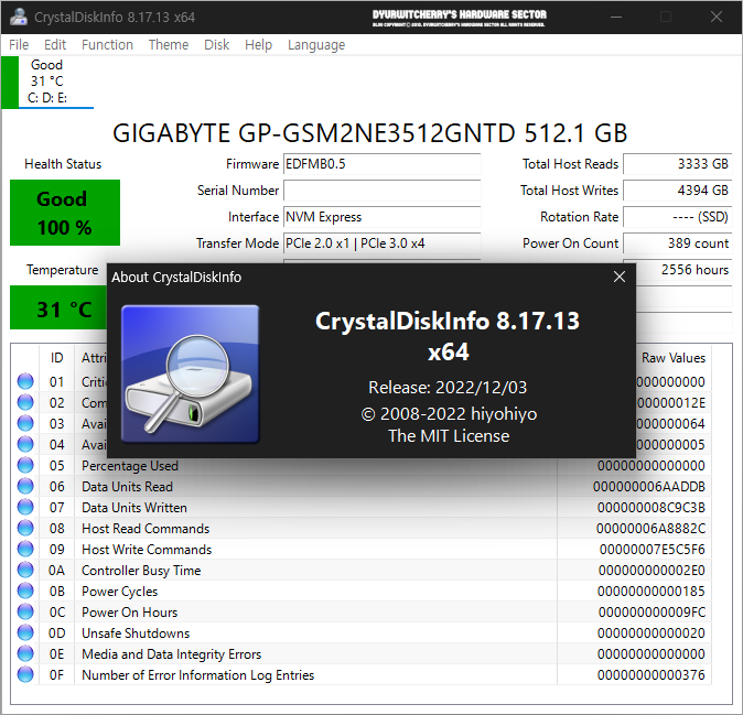 크리스탈디스크인포(CrystalDiskInfo)는 S.M.A.R.T. 기반 HDD와 SSD, NVME와 USB 메모리 정보 확인 및 모니터링 프로그램으로 포스팅 작성일 기준 최신 버전은 2022년 12월 03일에 릴리즈된 CrystalDiskInfo 8.17.13 버전 입니다. 크리스탈디스크인포는 단일 인터페이스 화면에 HDD와 SSD, NVME 등 디스크 펌웨어 정보와 시리얼 넘버, 전송 모드와 파티션 분할 정보, 사용 횟수와 사용 시간, 읽고 쓰기한 용량 등이 표시되며, 시스템 디스크가 2개 이상인 경우에 상단에 탭이 활성화 되어 개별 디스크의 정보를 확인 할 수 있습니다.