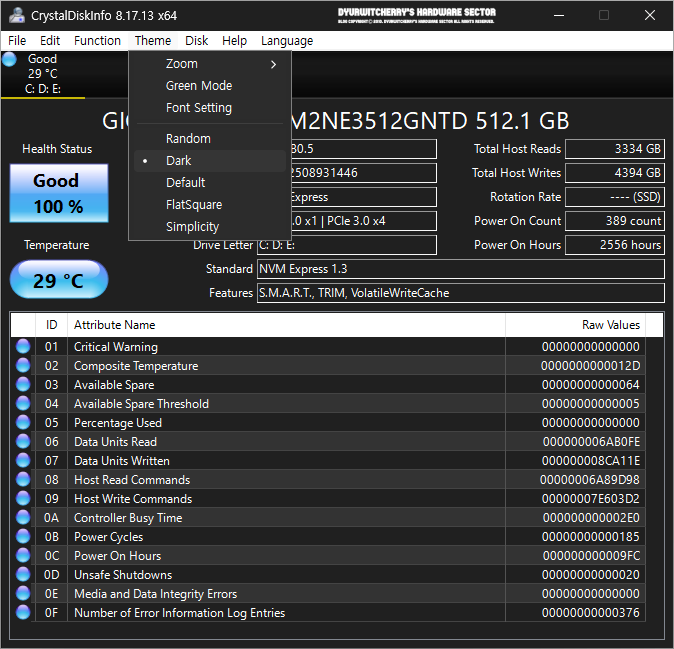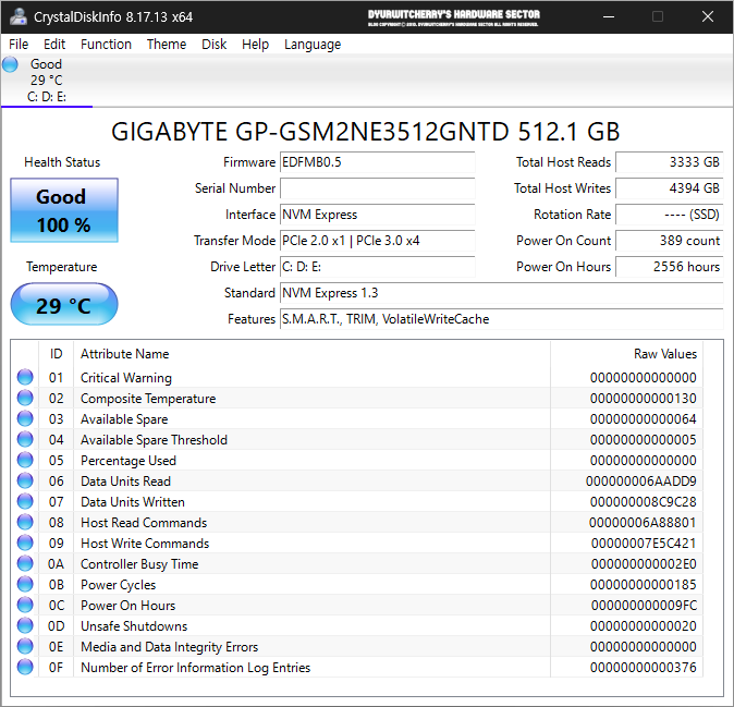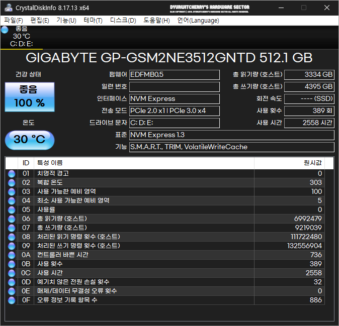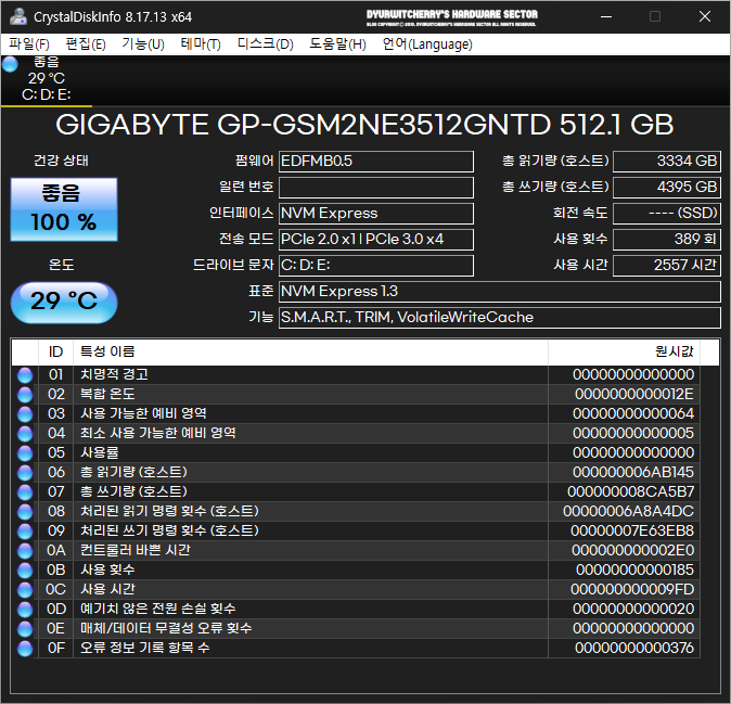 크리스탈디스크인포 기본 실행 시에는 프로그램 창 하단의 의 ID와 특성 이름(Attribute Name)이 한글 원시값(Raw values)이 16진수 헥사코드 값으로 표시되어 정보 확인이 어렵기 때문에 CrystalDiskInfo 상단 메뉴 중 '기능(U) - 고급 기능(F) - 원시값'에서 '10 (DEC)'를 선택하면 원시값이 10진수로 표시되어 디스크 정보를 용이하게 확인할 수 있습니다. 참고로 포스팅에 활용한 CrystalDiskInfo 8.17.13 포터블 버전의 디스크 정보는 M.2 2280 Form Factor에 PCI-Express 3.0 x4, NVMe 1.3 Interface의 'GIGABYTE GP-GSM2NE3 M.2 NVMe 512GB' 모델로, 사용자 시스템에 따라 디스크 정보에는 차이가 있습니다.