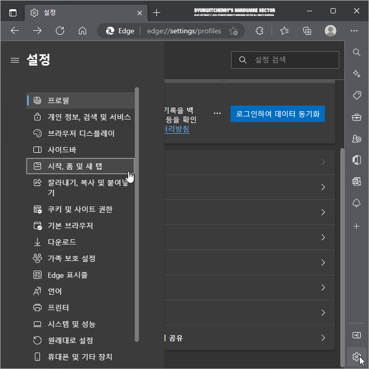 마이크로소프트 엣지 브라우저 사이드바가 표시가 활성화 되어 있는 경우에는 Microsoft Edge Browser 우측 사이드바 하단의 엣지 사이드바 숨기기 '⍈' 버튼 아래 '☼' 설정 버튼을 클릭하여 '☰ 설정(edge://settings)' 메뉴가 브라우저 설정에 따라 현재 탭 또는 새 탭, 새창으로 활성화 되면, 좌측 메뉴 상단의 '시작, 홈 및 새 탭' 항목을 선택 합니다.