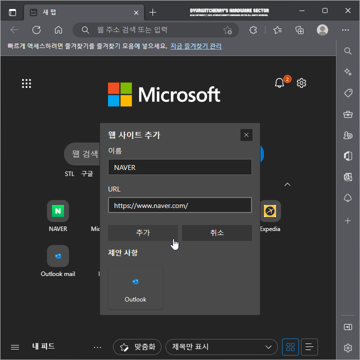 마이크로소프트 엣지 브라우저 새 탭 페이지에 정렬되어 있는 웹 사이트 바로가기 아이콘 마지막 부분에 '✚' 사이트 추가 버튼을 클릭하여 '웹 사이트 추가' 창이 활성화 되면, 이름 입력란에 NAVER와 Google, Daum과 Bing 등의 등록하고자 하는 검색엔진과 포털 사이트 이름 입력하고, URL에 'ex.https://www.naver.com/' 등의 주소를 '복사(Ctrl + C)','붙여넣기(Ctrl + V)' 방법 등을 이용하여 입력한 다음, 하단의 추가 버튼을 누르면, 웹 사이트가 Edge 새 탭 페이지에 추가 됩니다.