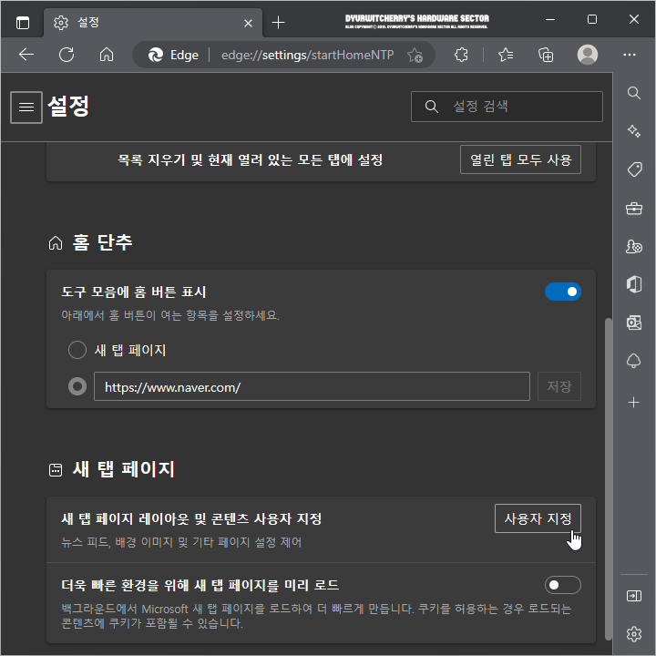 Microsoft Edge Browser '☰ 설정'의 '시작, 홈 및 새 탭' 항목을 선택한 후 '새 탭 페이지'의 '새 탭 페이지 레이아웃 및 콘텐츠 사용자 지정, 뉴스 피드, 배경 이미지 및 기타 페이지 설정 제어' 우측의 '사용자 지정' 버튼을 클릭합니다.