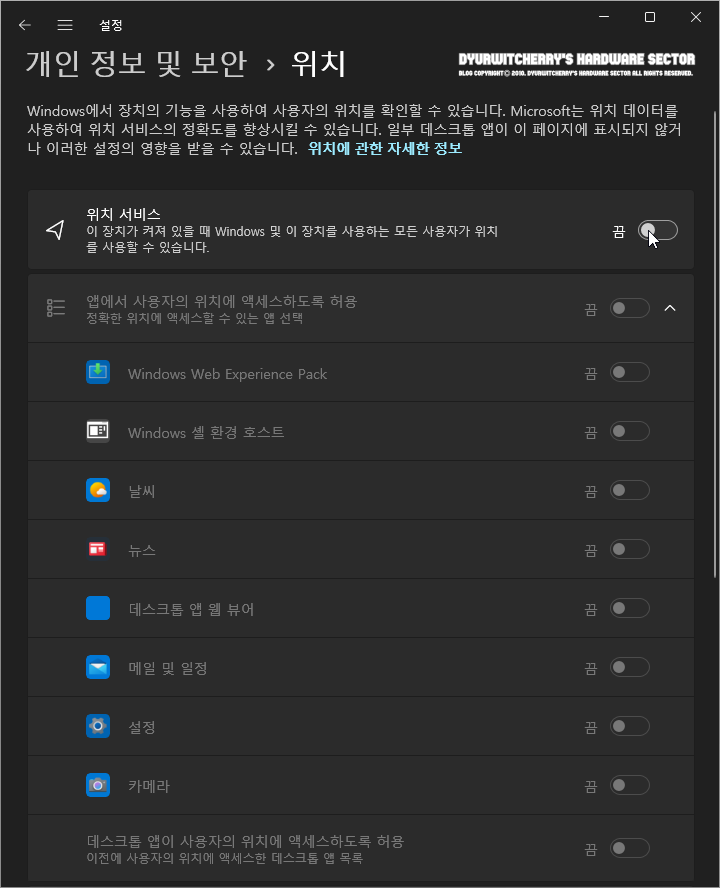 윈도우 11의 개별 어플리케이션의 위치 서비스 설정은 '앱에서 사용자의 위치해 액세스하도록 허용, 정확한 위치에 액세스할 수 있는 앱 선택 ∨'의 하단 콤보 버튼을 눌러 Windows Web Experience Pack과 Windows 셸 환경 호스트, 날씨와 뉴스, 데스크톱 앱 뷰너, 메일 및 일정, 설정과 카메라, 데스크톱 앱이 사용자의 위치에 액세스하도록 허용 등의 '○' 토글 버튼을 이동 시켜 '켬' 또는 '끔'으로 설정 할 수 있습니다.