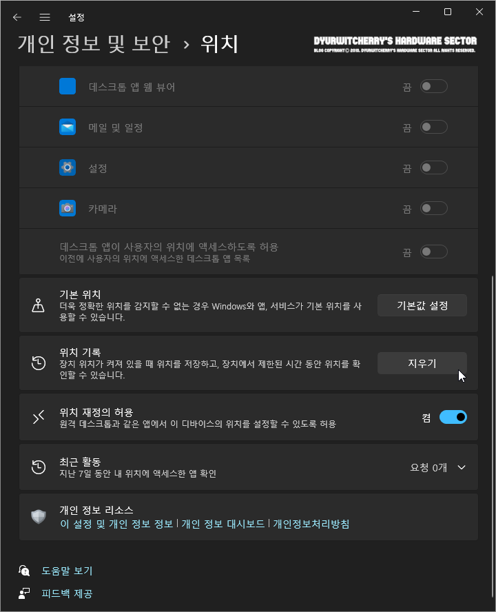 *윈도우 11 위치 서비스 설정 해제 및 위치 기록 지우기