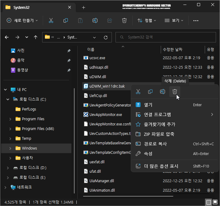 윈도우 11에서 'Unable to restore DWM.' DWM을 복원할 수 없습니다. 오류 문제가 발생하는 경우에는 파일 탐색기를 실행하여 'C:\Windows\System32' 폴더 경로 내의 파일 크기 약 1.34MB인 'uDWM_win11drc.bak' 백업 파일을 선택하여 삭제 하면 문제를 해결 할 수 있습니다.