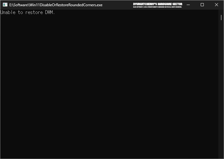 윈도우 11에서 'Win11 Disable Or Restore Rounded Corners.exe' 파일을 실행하여 라운드 형태의 둥근 테마를 모서리가 각진 형태로 변경한 다음 Windows 11 Update가 진행되면 다시 원래대로 둥근 테마로 변경이 되는데, 업데이트 이후 'Win11 Disable Or Restore Rounded Corners.exe' 파일을 다시 실행하면 'Unable to restore DWM.' 메시지가 나타나면서 모서리가 각진 사각형 테마로 변경이 되지 않는 문제가 있습니다.