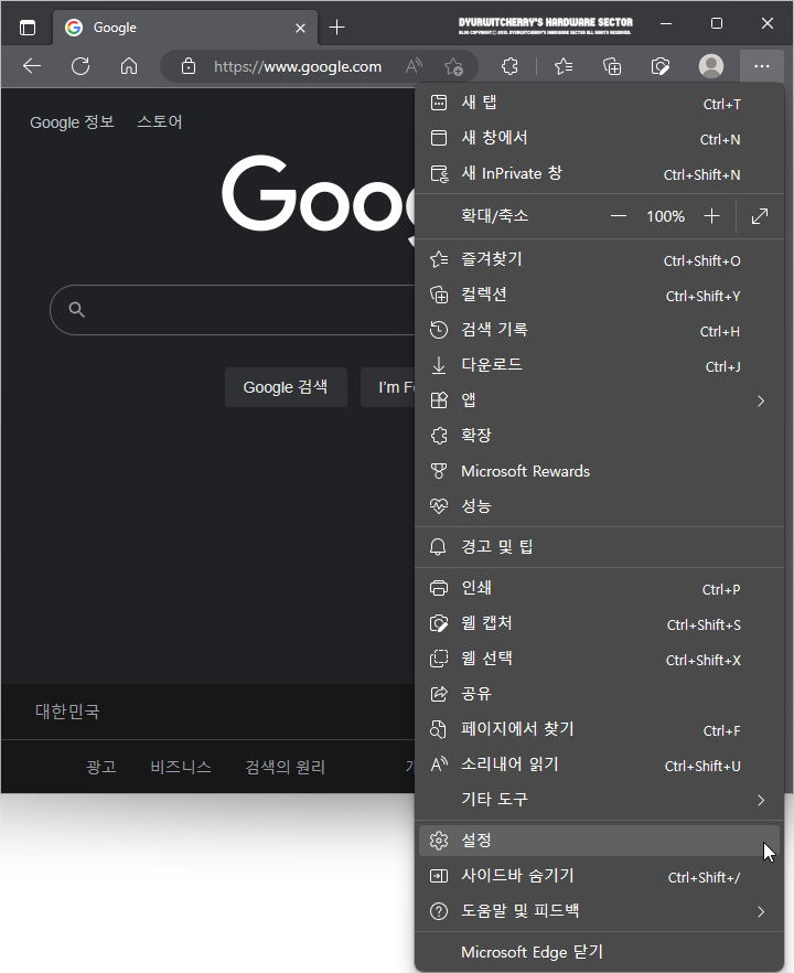 마이크로소프트 엣지 브라우저 절전 탭을 사용하여 리소스 저장 설정하는 방법은 먼저, Microsoft Edge Browser 상단 URL 주소 표시줄 오른쪽의 '…' 메뉴 버튼을 클릭하여 아래로 활성화 되는 세부 항목 중 '☼ 설정' 항목을 선택하면, 브라우저 설정에 따라 현재 탭 또는 새 탭, 새 창으로 '☰ 설정(edge://settings)' 창이 활성화 됩니다.