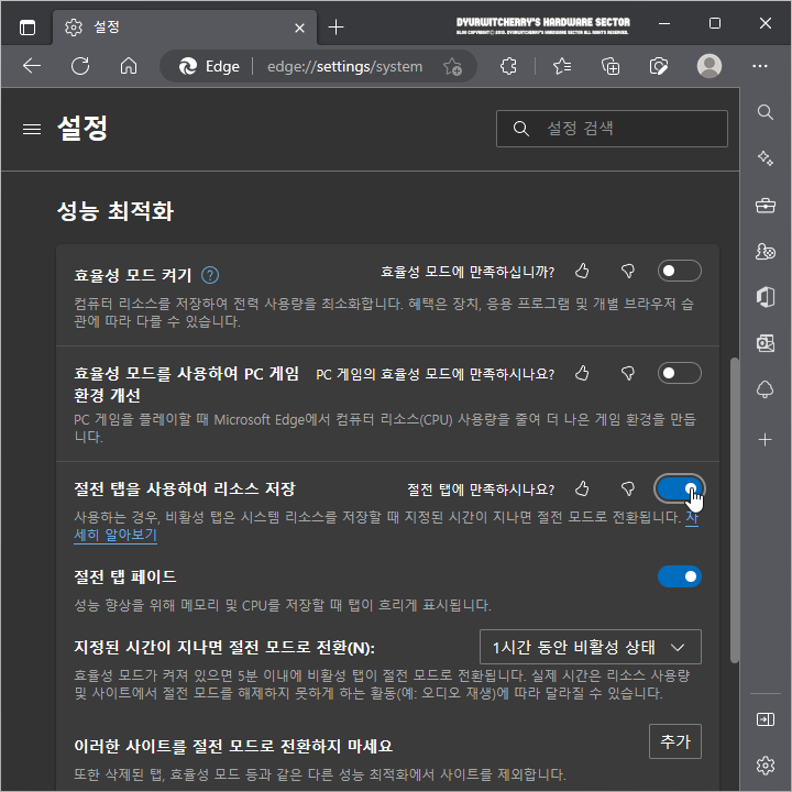 엣지 '설정 - 시스템 및 성능'의 성능 최적화 항목의 '절전 탭을 사용하여 리소스 저장 사용하는 경우, 비활성 탭은 시스템 리소스를 저장할 때 지정된 시간이 지나면 절전 모드로 전환 됩니다.' 우측의 '○' 토글 버튼을 좌측의 '끔'에서 오른쪽의 '켬'으로 이동 시키면 절전 탭 사용이 활성화 되고, 아래의 음영 처리되어 있던 '절전 탭 페이드', '성능 향상을 위해 메모리 및 CPU를 저장할 때 탭이 흐리게 표시됩니다.' 항목도 함께 활성화 됩니다.