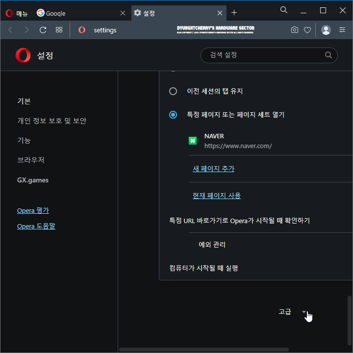 오페라 브라우저 'O 설정' 화면의 우측 스크롤바를 기본 항목 아래 끝 까지 내려 마지막 부분의 '고급 ▽' 항목을 클릭하면, 동일한 페이지 화면 내에서 추가 메뉴가 활성화 됩니다.