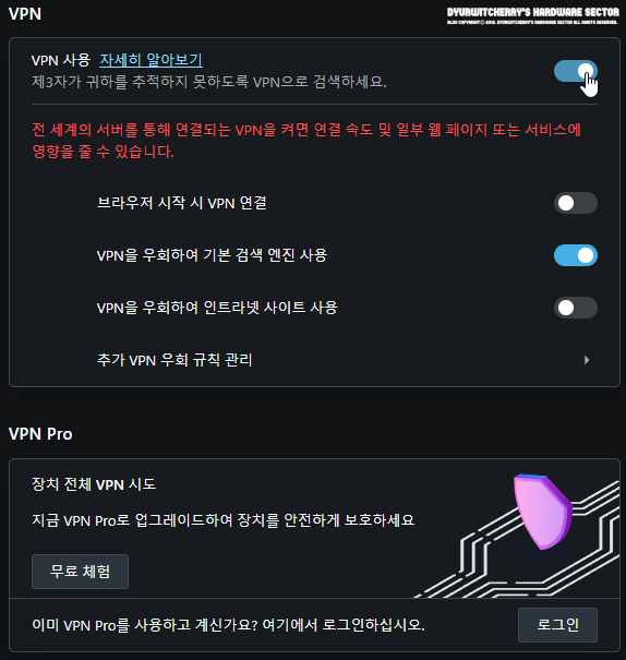 오페라 브라우저 VPN 사용 설정을 하면, URL 주소 표시줄 좌측에 VPN 표시가 나타나고, 검색한 웹 페이지 결과도 VPN(Virtual Private Network)을 이용하여 사이트 우회 접속이 됩니다. 참고로, Opera Browser의 VPN은 무료 버전과 시스템 디바이스 장치 전체가 VPN으로 설정 되어 사용 할 수 있는 VPN Pro 버전으로 구분이 되며, 기존에 VPN 프로 서비스를 이용하는 경우에는 계정을 이용하여 로그인 후 바로 사용 할 수 있습니다.