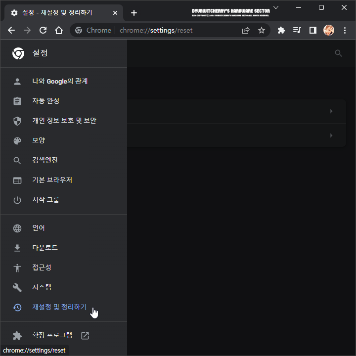 구글 크롬 브라우저 '☰ 설정(chrome://settings)' 창이 현재 창 또는 새 탭, 새 창으로 브라우저 설정에 따라 활성화 되면, 좌측 메뉴 중 하단의 '⟲ 재설정 및 정리하기' 항목을 클릭합니다.
