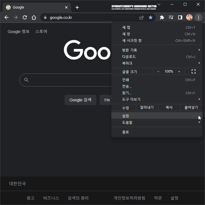 구글 크롬 브라우저 설정을 기본값으로 복원하여 초기화 하기 위해서는 먼저, Google Chrome Browser 상단 'URL' 주소 표시줄 우측의 '⁝' 메뉴 버튼을 클릭하여 아래로 확장되는 세부 메뉴 중 '설정' 항목을 선택 합니다.