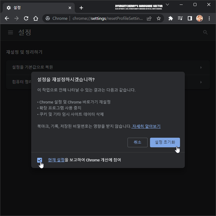 크롬 설정을 기본값으로 복원 항목을 클릭하면, 팝업 창이 활성화 되어 '설정을 재설정하시겠습니까? 이 작업으로 나타날 수 있는 결과는 다음과 같습니다.'의 '·Chrome 설정 및 Chrome 바로가기 재설정, ·확장 프로그램 사용 중지, ·쿠키 및 기타 임시 사이트 데이터 삭제' 등의 내용과 '북마크, 기록, 저장된 비밀번호는 영향을 받지 않습니다. 자세히 알아보기' 등의 내용을 확인하고 '설정 초기화 버튼'을 누르면 크롬 설정이 초기화 됩니다. 참고로, 기본 옵션으로 적용되어 있는 '☑ 현재 설정을 보고하여 Chrome 개선에 참여' 항목은 사용 환경에 따라 '☑' 체크 또는 '□' 체크 해제를 하고 설정을 초기화 하면 됩니다.