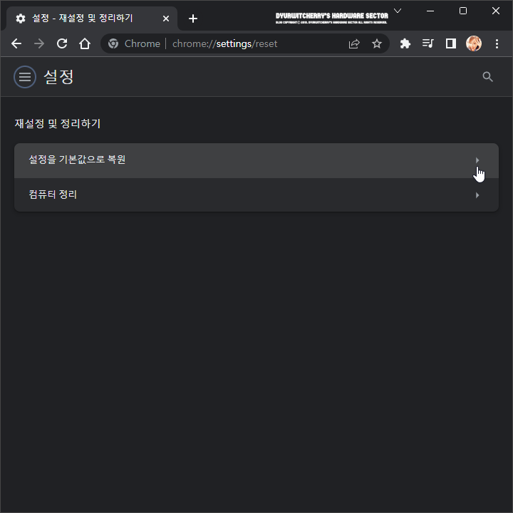 구글 크롬 '설정 - ⟲ 재설정 및 정리하기'를 클릭하여, 브라우저 설정에 따라 현재 탭 또는 새 탭, 새 창으로 '재설정 및 정리하기 화면으로 이동하면 '설정을 기본값으로 복원 ▷' 항목을 선택합니다.