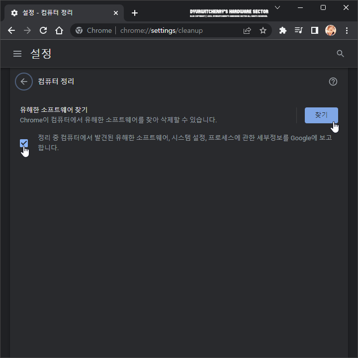 크롬 컴퓨터 정리의 '유해한 소프트웨어 찾기, Chrome이 컴퓨터에서 유해한 소프트웨어를 찾아 삭제할 수 있습니다.' 우측의 '찾기' 버튼을 클릭합니다. 참고로, '☑ 정리 중 컴퓨터에서 발견된 유해한 소프트웨어, 시스템 설정, 프로세스에 관한 세부 청보를 Google에 보고합니다.' 항목이 디폴트 옵션에서 '☑' 체크되어 있어 사용환경에 따라 '☑' 체크 또는 '□' 체크 해제한 다음 '찾기' 버튼을 선택하면 됩니다.