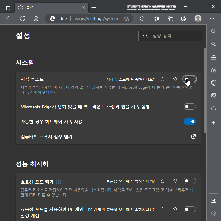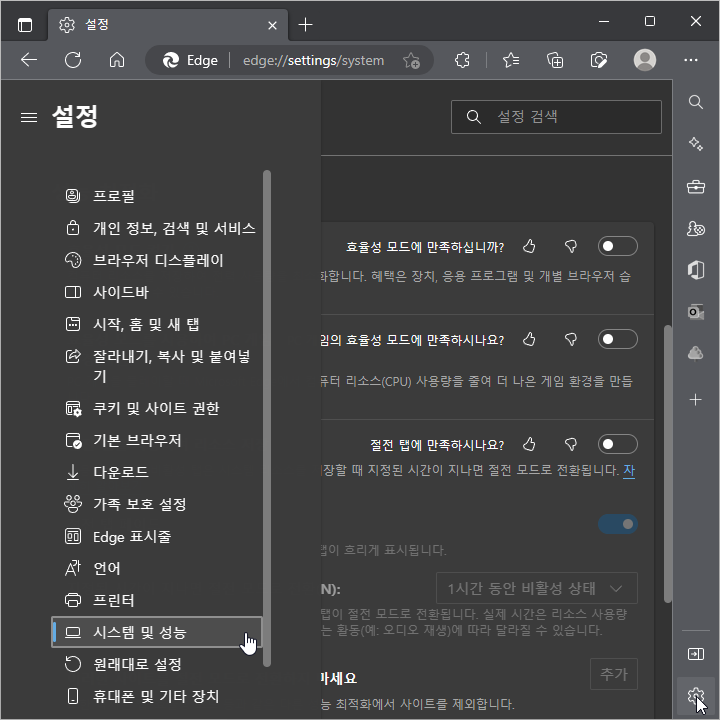 마이크로소프트 엣지 브라우저 사이드바가 표시가 활성화 되어 있는 경우에는 Microsoft Edge Browser 오른쪽(기본 값) 사이드바 하단의 엣지 사이드바 숨기기 '⍈' 버튼 아래 '☼' 설정 버튼을 클릭하여 '☰ 설정(edge://settings)' 메뉴가 브라우저 설정에 따라 현재 탭 또는 새 탭, 새창으로 활성화 되면, 좌측 메뉴 하단의 '시스템 및 성능' 항목을 선택 합니다.