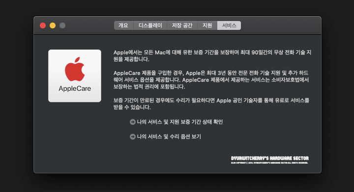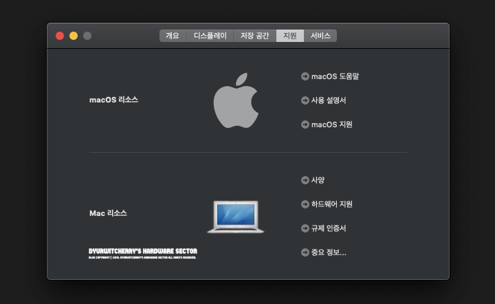맥OS 모하비 10.14 업데이트 설치 이후 다크 테마를 선택하여 적용한 화면을 캡처한 것으로, 개요와 디스플레이, 저장 공간과 지원, 서비스 등의 기본 메뉴는 이전 버전인 macOS High Sierra (10.13)와 큰 차이가 없습니다.