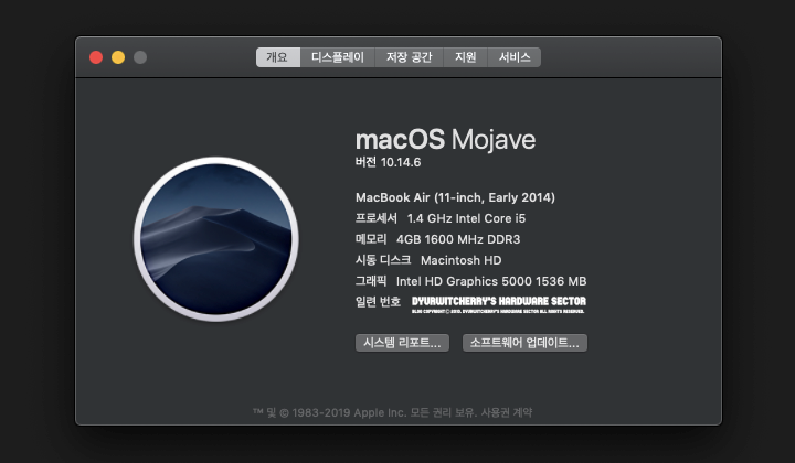 macOS Mojave 10.14.6 버전을 MacBook Air Early 2014 모델에 설치하여 사용중인 화면을 캡처 한 것으로, 맥북어에 11인치 모델은 최대 2.7GHz Turbo Boost 및 3MB 공유 L3 캐시의 Intel Core i5 1.6GHz 듀얼 코어 CPU에 PCIe 기반의 Flash 형태의 SSD 저장 장치 및 Intel HD Graphics 5000 내장 디스플레이가 기본 탑재되어 시스템 메모리 중 1536MB를 그래픽 메모리로 공유하여 사용하고 있습니다.