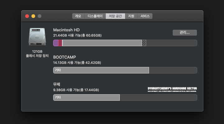 포스팅에 활용한 맥북에어 Early 2014 모델은 저장 장치 128GB SSD에 부트캠프를 이용하여 윈도우 10 과 멀티 부팅을 이용하여 사용하고 있으며, 약 10GB공간은 백업 공간으로 파티션 분할 되어 있는 시스템에서 macOS Mojave 10.14 Update를 진행 하였습니다.